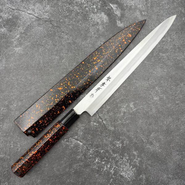 四季彩系列以日本四季之美為靈感,結合傳統工藝與現代設計,展現和包丁的典雅與實用。此款柳刃正夫選用白三鋼高碳鋼為刀芯,經傳統霞研工藝精心打造,切味銳利,能夠輕鬆完成刺身及精細切割。